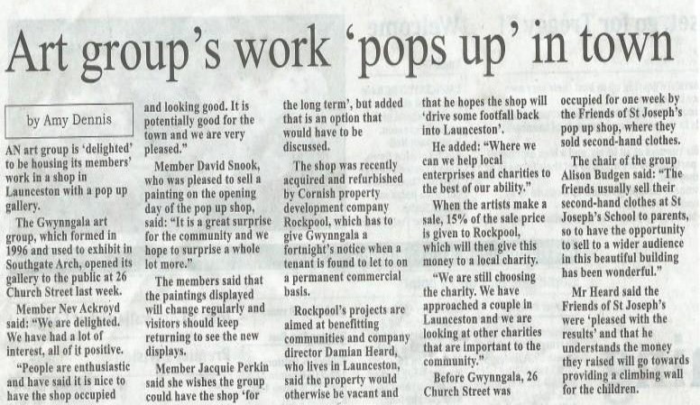 Rockpool have agreed that Gwynngala, a successful group of local artists can create a pop up gallery in the newly refurbished shop at 26 Church Street, Launceston. The gallery will remain until a permanent tenant for the shop can be found can be found, Gwynngala will donate 15% of their takings from the gallery to Rockpool. Rockpool has decided that this money will all be directly donated to the Launceston Memory Cafe, who do a fantastic job, helping to support people with dementia, and their carers within our local community.